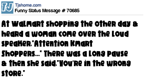 X was at Walmart shopping the other day & heard a woman come over the loud speaker,"Attention Kmart Shoppers..." There was a long pause & then she said,"You're in the wrong store."