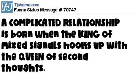 - # 72105 A complicated relationship is when the Queen of mixed signals hooks up with the King of idiots.