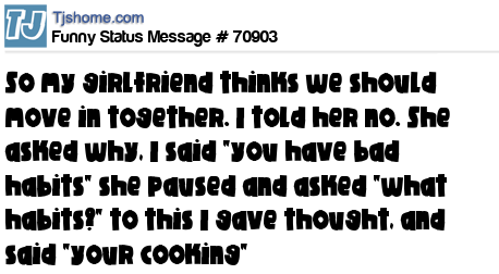X is So my girlfriend thinks we should move in together. I told her no. She asked why, I said "you have bad habits" she paused and asked "what habits?" to this I gave thought, and said "your cooking"