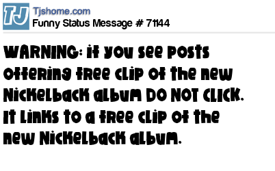 - # 113225 Be careful when clicking links on FB. There is a new one going around that says if you click it, it goes to a page where you can get the new Nickelback album for free. When you click it, it takes you to a page to get the new Nickelback album for free. :/