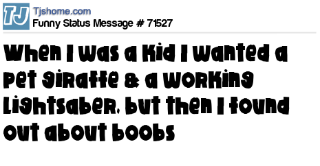 X says When I was a kid I wanted a pet giraffe & a working lightsaber, but then I found out about boobs