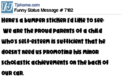 - # 130774 Here’s a bumper sticker I’d like to see: “We are the proud parents of a child who’s self-esteem is sufficient that he doesn’t need us promoting his minor scholastic achievements on the back of our car.”