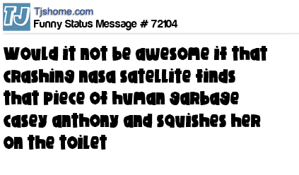 X is would it not be awesome if that crashing nasa satellite finds that piece of human garbage casey anthony and squishes her on the toilet