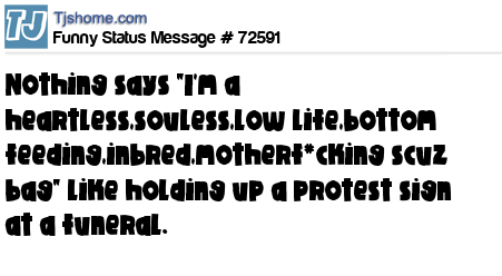X  Nothing says "I'm a heartless,souless,low life,bottom feeding,inbred,motherf*cking scuz bag" like holding up a protest sign at a funeral.