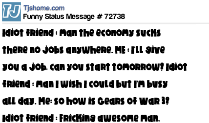 X Idiot friend : man the economy sucks there no jobs anywhere. ME : I'll give you a job, can you start tomorrow? Idiot friend : man I wish I could but I'm busy all day. Me: so how is Gears of War 3? Idiot friend : Fricking awesome man.