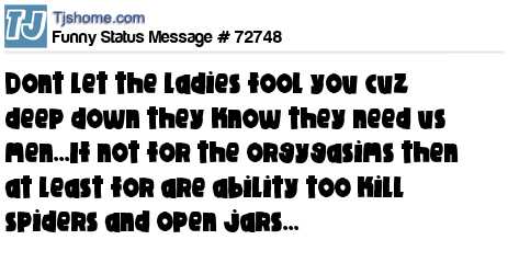 X says Dont let the ladies fool you cuz deep down they know they need us men...If not for the orgygasims then at least for are ability too kill spiders and open jars...