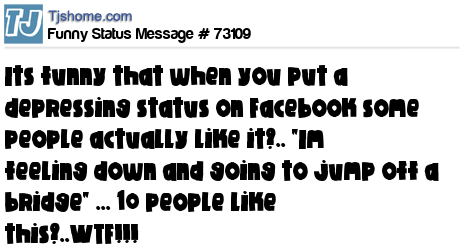 X says Its funny that when you put a depressing status on Facebook some people actually like it?.. "Im feeling down and going to jump off a bridge" ... 10 people like this?..WTF!!!