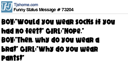 X says BOY:"Would you wear socks if you had no feet?" GIRL:"Nope." BOY:"Then, why do you wear a bra?" GIRL:"Why do you wear pants?"