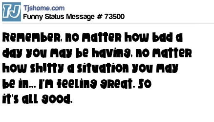 X Remember, no matter how bad a day you may be having, no matter how sh!tty a situation you may be in... I'm feeling great. So it's all good.