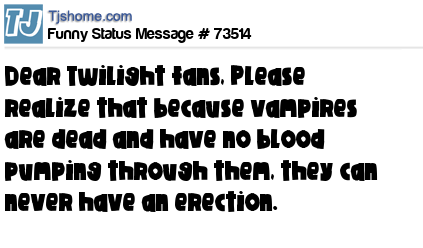 - # 32409 Dear twilight fans : Please realise that cause Vampires are dead, and have no blood pumpin through them, they can never get an erection ! Enjoy fantasizing about that !!