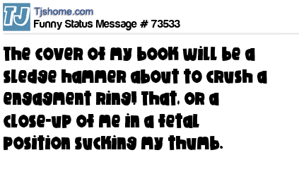 X is The cover of my book will be a sledge hammer about to crush a engagment ring! That, or a close-up of me in a fetal position sucking my thumb.