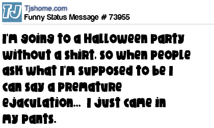 X I'm going to a Halloween party without a shirt, so when people ask what I'm supposed to be I can say a premature ejaculation... I just came in my pants.