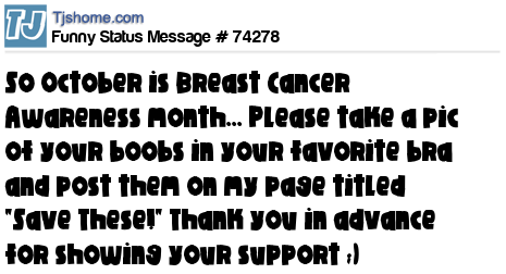 - # 73993 Idea: October is Breast Cancer Awareness month.. instead of posting your color bra, why not take a pic of your boobs, post them and say "Save These!" . .why beat around the bush? (or bare floor)