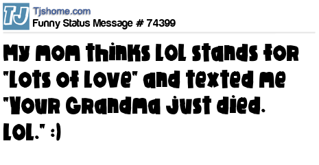- # 74235 My mom thinks LOL stands for "lots of love" and texted me "Your Grandma just died. LOL."