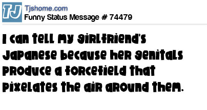 X is I can tell my girlfriend's Japanese because her genitals produce a forcefield that pixelates the air around them.