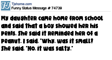 - # 81395 My daughter told her mother that a kid in class showed her his peck*r. My wife flipped. My daughter said it reminded her of a peanut, so my wife asked her if it was small. My daughter said, "No, salty."