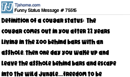 X is Definition of a cougar status: The cougar comes out in you after 22 years living in the zoo behind bars with an a$$hole, then one day you wake up and leave the a$$hole behind bars and escape into the wild jungle....freedom to be yourself!!!