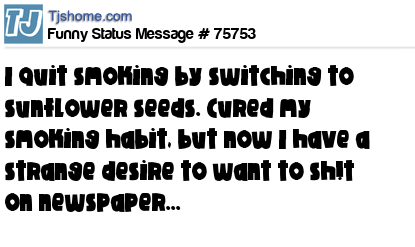 - # 75751 Quit smoking by switching to sunflower seeds. Cured my smoking but now I have a strange desire to shit on newspaper.