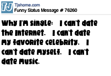 X is why I'm single: ☑ I can't date the Internet. ☑ I can't date my favorite celebrity. ☑ I can't date myself. ☑ I can't date music.