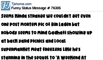 X Seems kinda strange we couldn't get even one post mortem pic of Bin Laden but nobody seems to mind Gadhafi showing up at back yard picnics and local supermarket meat freezers like he's starring in the sequel to "A Weekend At Bernie's".....Go figure!