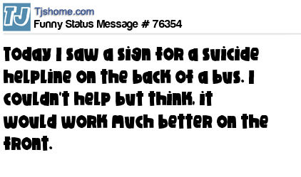 - # 129089 Just saw a sign for a suicide helpline on the back of a bus. Wouldn't it be a lot more helpful if it was on the front?