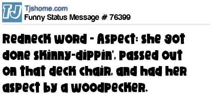 X is Redneck word - Aspect: she got done skinny-dippin', passed out on that deck chair, and had her aspect by a woodpecker.