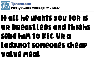 - # 76594 Ladies: If he is only interested in your breasts, legs and thighs send him to KFC. Don't be his value meal.