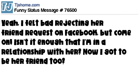X Yeah, I felt bad rejecting her friend request on Facebook, but come on! Isn't it enough that I'm in a relationship with her? Now I got to be her friend too?