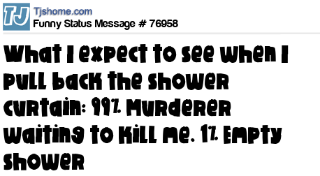 - # 82736 Just saw a huge spider while I was getting out of the shower. So I pulled down the shower curtain rod & pole vaulted over it into the hallway.