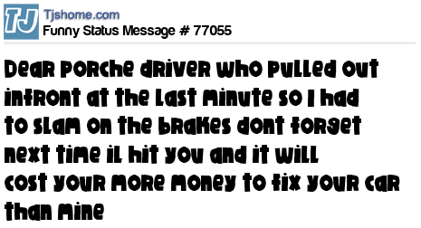 X is dear porche driver who pulled out infront at the last minute so I had to slam on the brakes dont forget next time il hit you and it will cost your more money to fix your car than mine