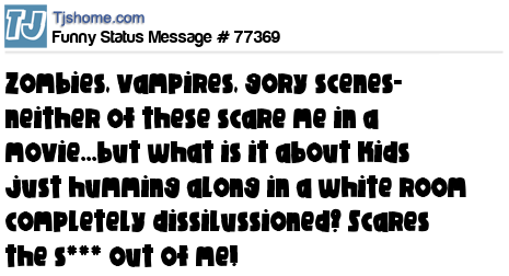 X says zombies, vampires, gory scenes- neither of these scare me in a movie...but what is it about kids just humming along in a white room completely dissilussioned? Scares the s*** out of me!