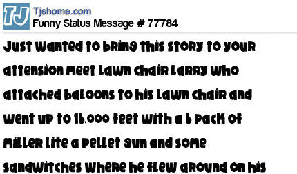 X is just wanted to bring this story to your attension meet lawn chair larry who attached baloons to his lawn chair and went up to 16,000 feet with a 6 pack of miller lite a pellet gun and some sandwitches where he flew around on his lawn chair for 14 hours lm
