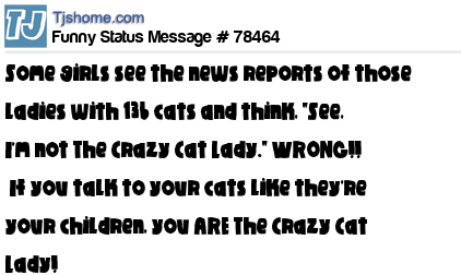 X Some girls see the news reports of those ladies with 136 cats and think, "See, I'm not The Crazy Cat Lady." WRONG!! If you talk to your cats like they're your children, you ARE The Crazy Cat Lady!