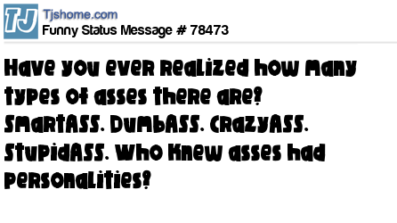 X says Have you ever realized how many types of asses there are? SmartASS. DumbASS. CrazyASS. StupidASS. Who knew asses had personalities?