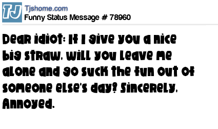 X says Dear idiot: If I give you a nice big straw, will you leave me alone and go suck the fun out of someone else's day? Sincerely, Annoyed.