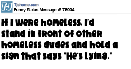 X says If I were homeless, I'd stand in front of other homeless dudes and hold a sign that says "He's lying."