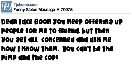 - # 81892 Dear Facebook: You keep offering up people for me to "friend", but then you get all concerned and ask me how I know them. You can't be the pimp and the cop!