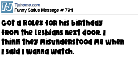 - # 174601 The lesbians next door gave my a Rolex for my birthday. I think they misunderstood when I said "I wanna watch."