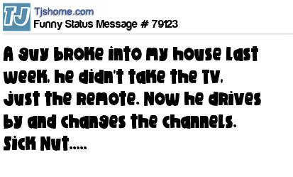 - # 197035 A guy broke into our apartment last week.. He didn't take the TV, just the remote. Now he drives by and changes the channels