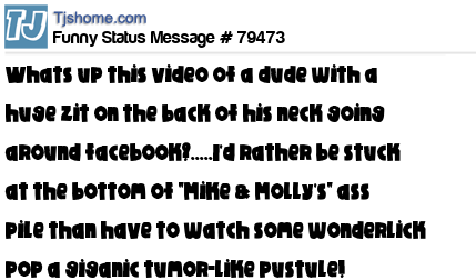 X Whats up this video of a dude with a huge zit on the back of his neck going around facebook?.....I'd rather be stuck at the bottom of "Mike & Molly's" ass pile than have to watch some wonderlick pop a giganic tumor-like pustule!