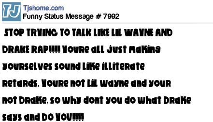 X says STOP TRYING TO TALK LIKE LIL WAYNE AND DRAKE RAP!!!! Youre all just making yourselves sound like illiterate retards. Youre not Lil wayne and your not Drake, so why dont you do what Drake says and DO YOU!!!!