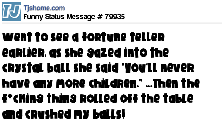 X Went to see a fortune teller earlier, as she gazed into the crystal ball she said "You'll never have any more children." ...Then the f*cking thing rolled off the table and crushed my balls!