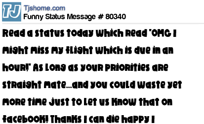 X read a status today which read "OMG I might miss my flight which is due in an hour!" As long as your priorities are straight mate...and you could waste yet more time just to let us know that on facebook! Thanks I can die happy I guess..