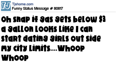 X says Oh snap if gas gets below $3 a gallon looks like I can start dating girls out side my city limits....Whoop Whoop