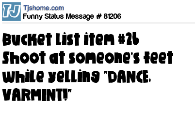 X says Bucket list item #26 Shoot at someone's feet while yelling "DANCE, VARMINT!"