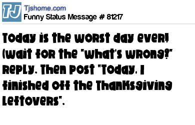 X Today is the worst day ever! (wait for the "what's wrong?" reply. Then post "Today, I finished off the Thanksgiving leftovers".