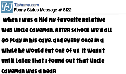 X says When I was a kid my favorite relative was Uncle Caveman. After school we'd all go play in his cave, and every once in a while he would eat one of us. It wasn't until later that I found out that Uncle Caveman was a bear