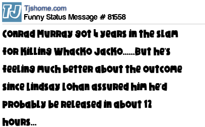 X Conrad Murray got 4 years in the slam for killing Whacko Jacko......But he's feeling much better about the outcome since Lindsay Lohan assured him he'd probably be released in about 12 hours...