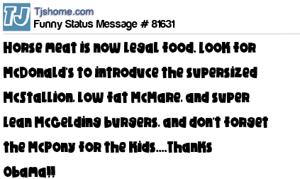 X Horse meat is now legal food. Look for McDonald's to introduce the supersized McStallion, low fat McMare, and super lean McGelding burgers, and don't forget the McPony for the kids....Thanks Obama!!