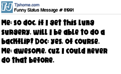 X is Me: so doc, if I get this lung surgery, will I be able to do a backflip? Doc: yes, of course. Me: awesome, cuz I could never do that before.
